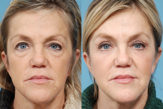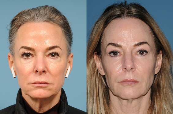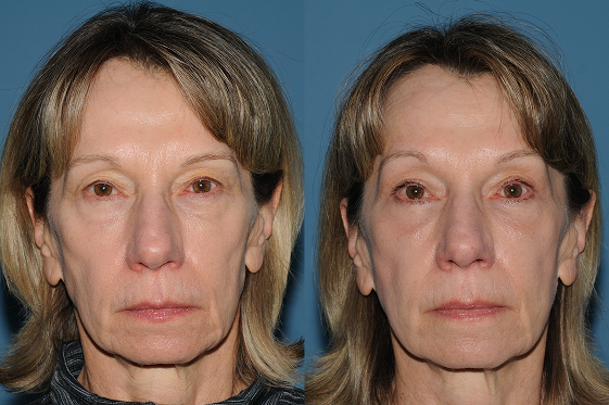 This is a 60 y/o woman who was showing generalized aging in her face with excellent skin quality and minimal loss of facial volume. She has an endoscopic brow lift which lifted the outer one-third of the eyebrows, without over-elevating the inner part of the brow. This avoids a surprised or startled look. She also had a lower blepharoplasty in addition to a facelift. She now appears refreshed and enlivened.