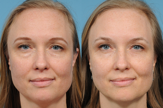 This is a 43 y/o woman with a very common problem where the fat of the lower eyelid bulges forward, causing what appear to be dark circles. This condition called, pseudo-herniation of the orbital fat, is often an inherited trait that can be seen within your family tree.